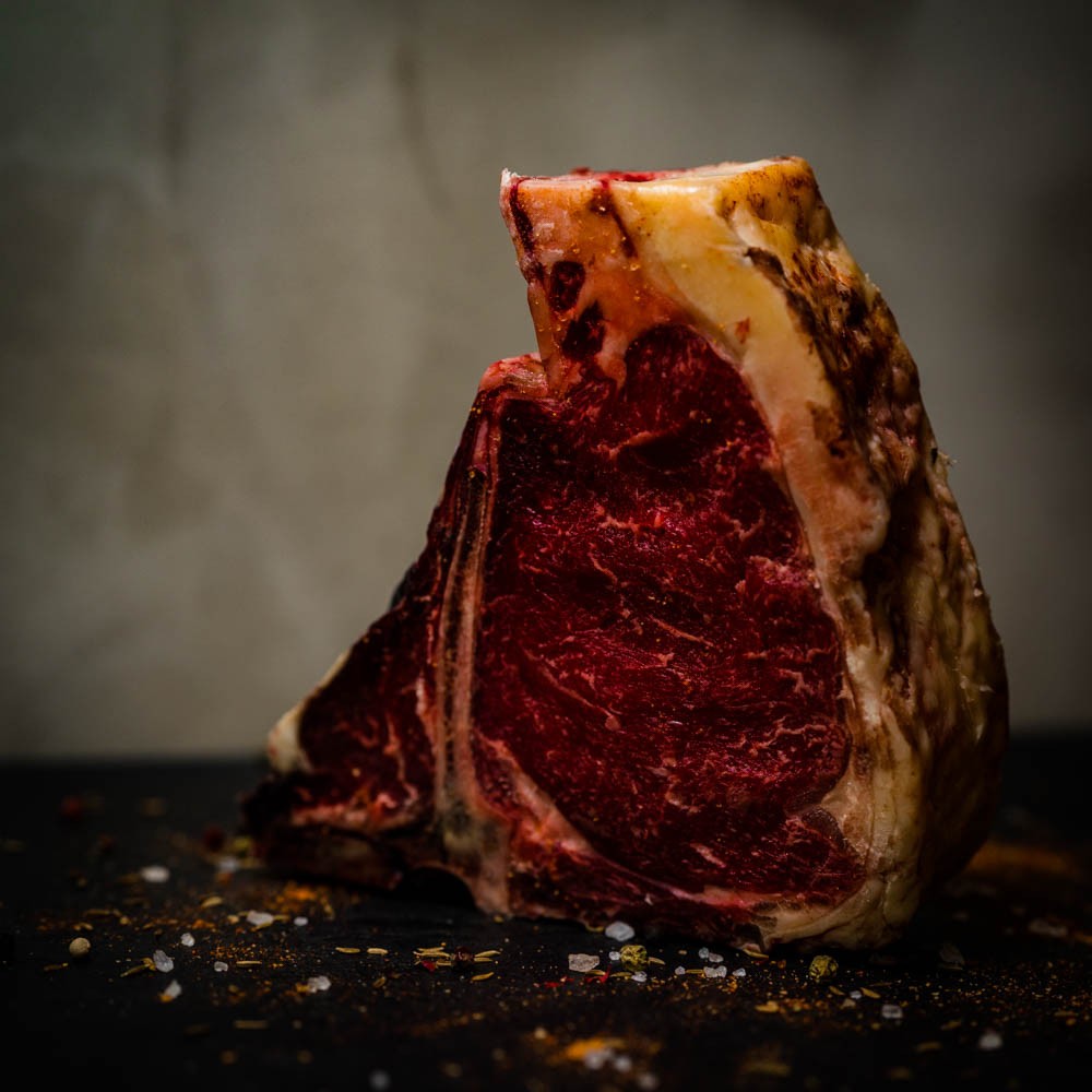 Ce T-Bone Steak est découpé du bas du dos et sépare le filet de boeuf et le faux-filet, maturée dans nos chambres de maturation pendant 6 semaines, extra tendre et gouteux! La race Shorthorn qui provient initalement des montagnes du Hymalaia se sont implanté maintenant sur les champs verts d'Angleterre.
